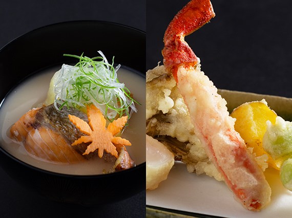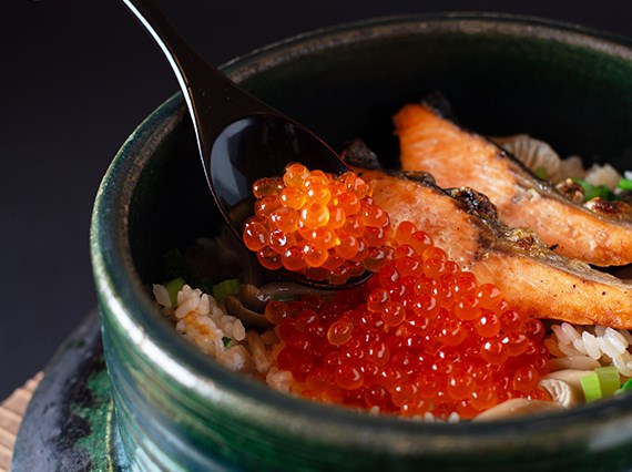 北海道産食材だけでなく郷土料理もはなの流にアレンジ。粕汁と石狩鍋が融合した煮物椀は、芳醇な酒粕と自家製味噌が秋鮭の旨みと重なります。はなの名物の釜飯には鰊と数の子の「親子釜飯」が楽しめます。