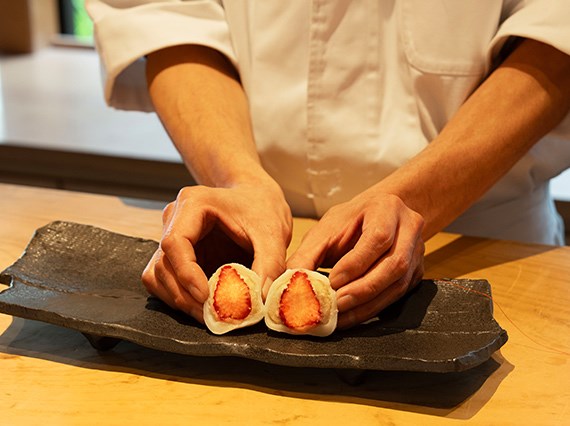 旬のいちごを使った和菓子の定番「苺大福」を実演。糸でカットして、みずみずしい赤い宝石の美しい断面もお楽しみください。